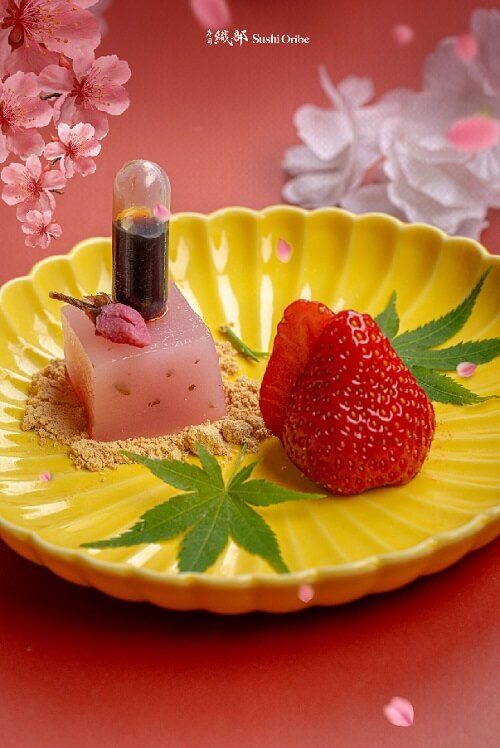 Marinated medai with Butterbur Miso, Sakura Trout with Salted Cherry Blossom,